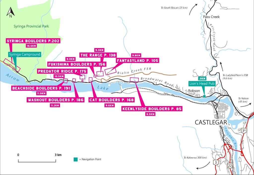 One of the most extensive bouldering sectors in the West Kootenays. The Arrow Lake area hosts 540 problems and counting as development is ongoing and the potential is still strong. Located just on the outskirts of Castlegar, British Columbia, there are ample opportunities for camping, lodging food and supplies in the region. Expect lots of sunny days, long seasons and hot summers. The best time to visit the area is during the spring and fall months.