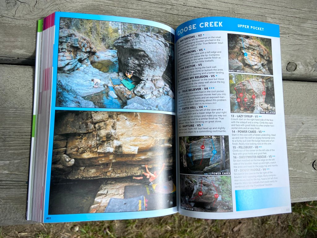 After 5 amazing years since the release of the first ever Bouldering Guidebook to the West Kootenays the time has come for the new (2nd) edition. With over 800 NEW problems, 550 pages, a whole new chapter and a little tweaking with the look, the 2nd Edition is destined to be MEGA! There are now a total of 1765 Problems spread over 4 chapters with several new areas including, Ymir Boulders, Goose Creek, the Kamikaze Boulder and many others. The new chapter ‘CASTLEGAR’ features 6 new stellar areas that are destined to become classic and popular with their short approaches and high density of quality bouldering. Almost every zone from the first edition has seen an update, upgrade and/or addition of new problems.
